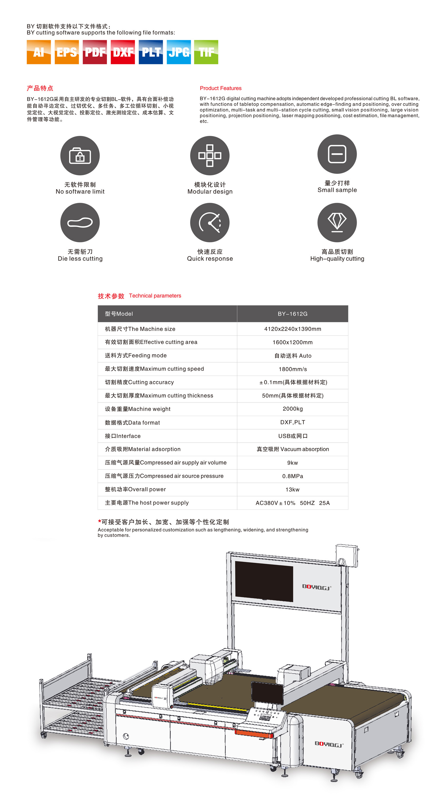 BY-1612G menggunakan perangkat lunak pemotongan BL eksklusif yang dilengkapi dengan kompensasi permukaan kerja untuk deteksi dan penempatan tepi otomatis, optimasi pemotongan berlebih, kemampuan multi-tugas, pemotongan siklik multi-stasiun, penempatan visual area kecil, penempatan visual area besar, penempatan berbasis proyeksi, penempatan survei laser, perkiraan biaya, dan manajemen file.