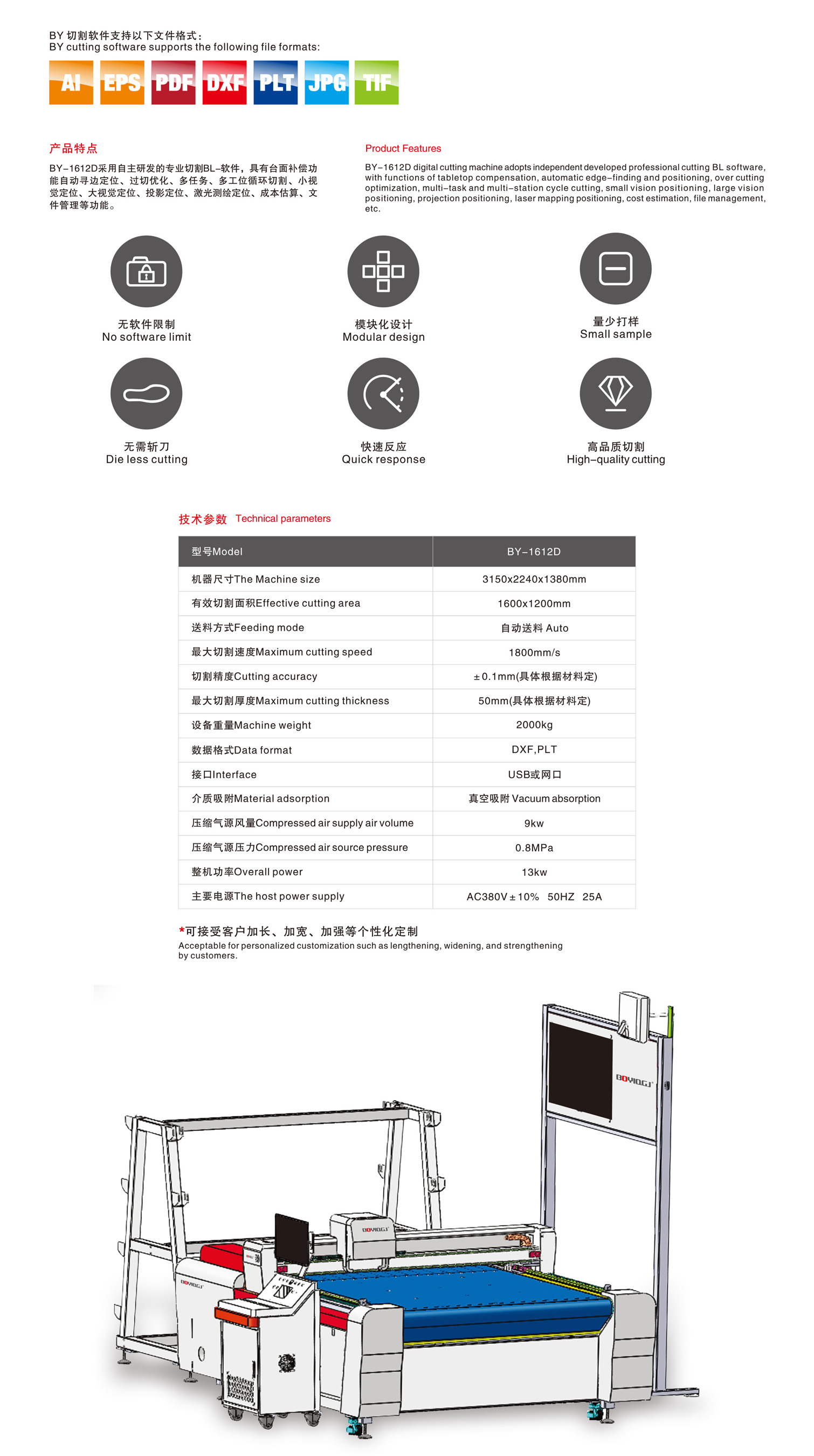 BY-1612D menggunakan perangkat lunak pemotongan BL eksklusif yang dilengkapi dengan kompensasi permukaan kerja, deteksi dan penempatan tepi otomatis, optimasi pemotongan berlebih, kemampuan multi-tugas, pemotongan siklik multi-stasiun, penempatan visual area kecil, penempatan visual area besar, penempatan berbasis proyeksi, penempatan survei laser, perkiraan biaya, dan manajemen file.