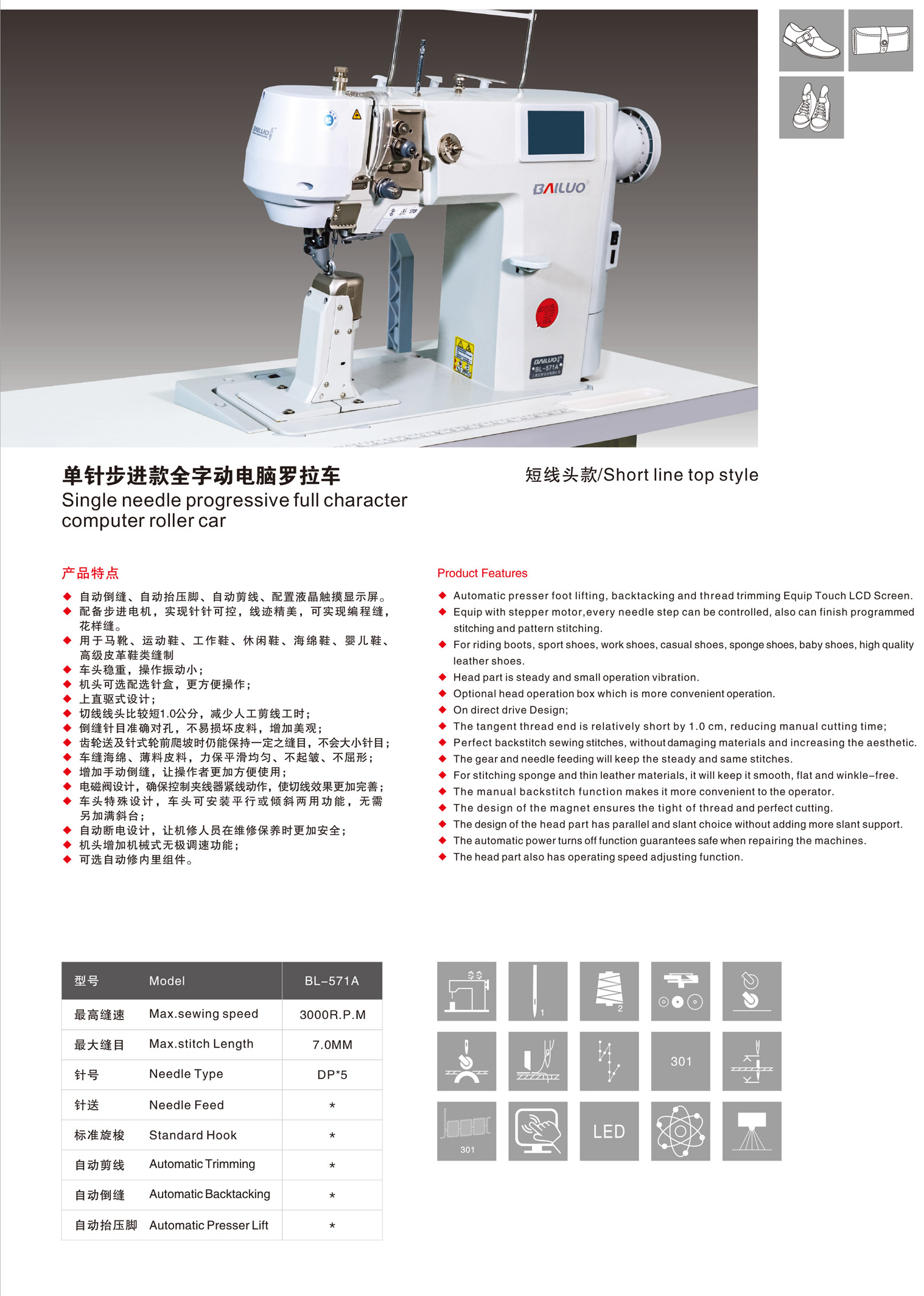 Jahitan balik otomatis, pengangkat kaki penekan otomatis, pemotongan benang otomatis, dilengkapi dengan layar sentuh LCD. Dilengkapi dengan motor langkah untuk kontrol jahitan yang presisi, menghasilkan pola jahitan yang indah. Mampu melakukan jahitan terprogram dan jahitan dekoratif.