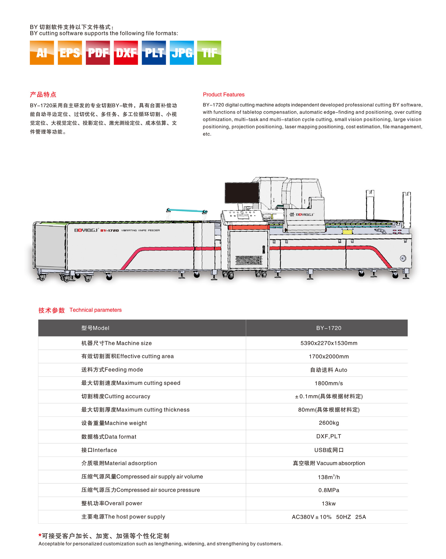BY-1720 sử dụng phần mềm cắt chuyên dụng BY- do chính hãng phát triển, có các chức năng như bù đắp mặt bàn, định vị tự động theo cạnh, tối ưu hóa cắt quá mức, đa nhiệm, cắt tuần hoàn đa vị trí, định vị thị giác nhỏ, định vị thị giác lớn, định vị bằng chiếu sáng, định vị bằng đo đạc laser, ước tính chi phí, quản lý tệp tin, v.v.