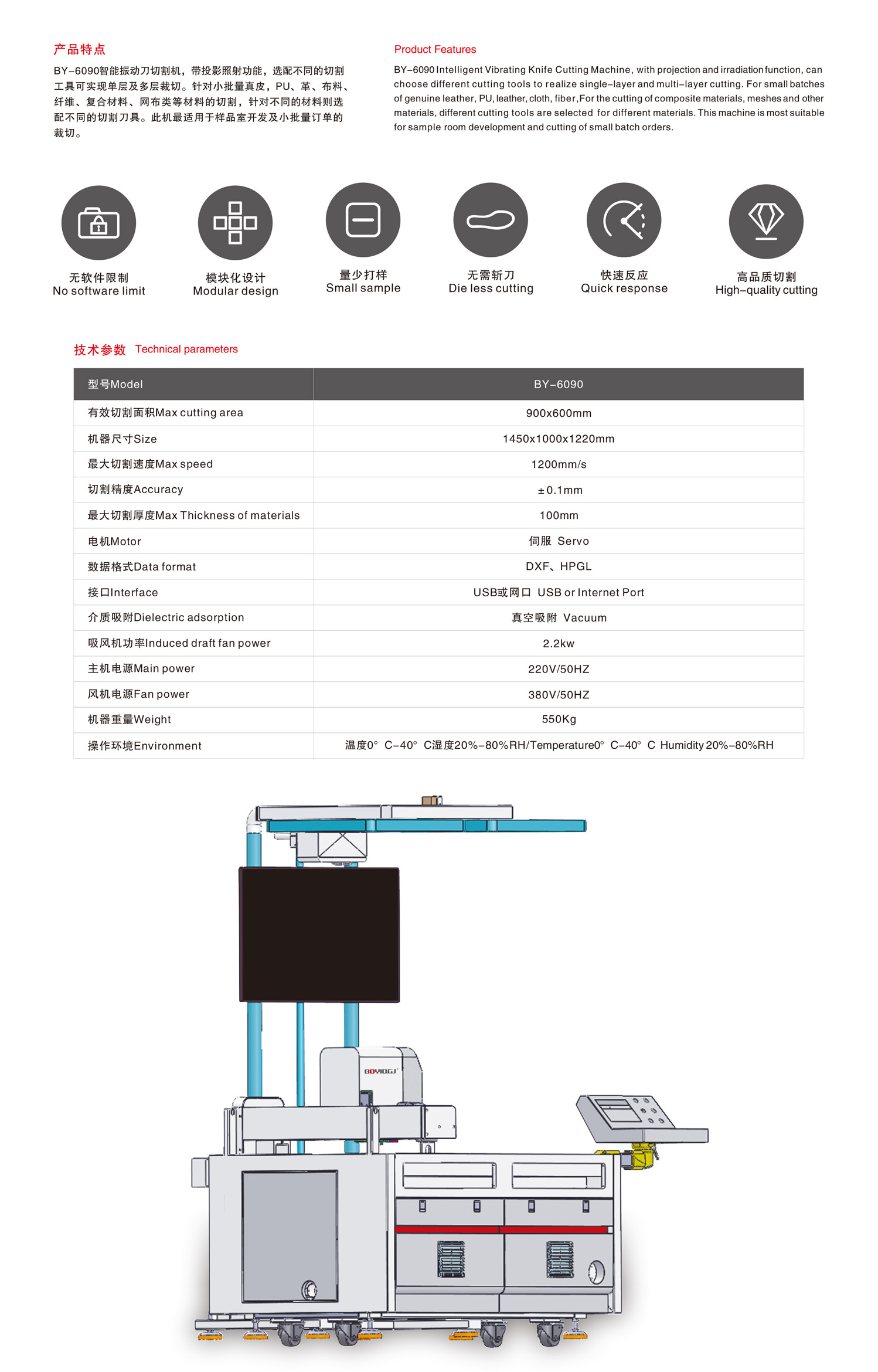 Máy cắt dao rung thông minh BY-6090, có chức năng chiếu sáng, có thể lựa chọn các công cụ cắt khác nhau để thực hiện cắt một lớp hoặc nhiều lớp. Máy này phù hợp để cắt các vật liệu như da thật, PU, da tổng hợp, vải, sợi, vật liệu composite, vải lưới, v.v. với số lượng nhỏ. Đối với các loại vật liệu khác nhau, cần lựa chọn dao cắt phù hợp. Máy này đặc biệt thích hợp cho việc phát triển mẫu trong phòng mẫu và cắt các đơn hàng số lượng nhỏ.