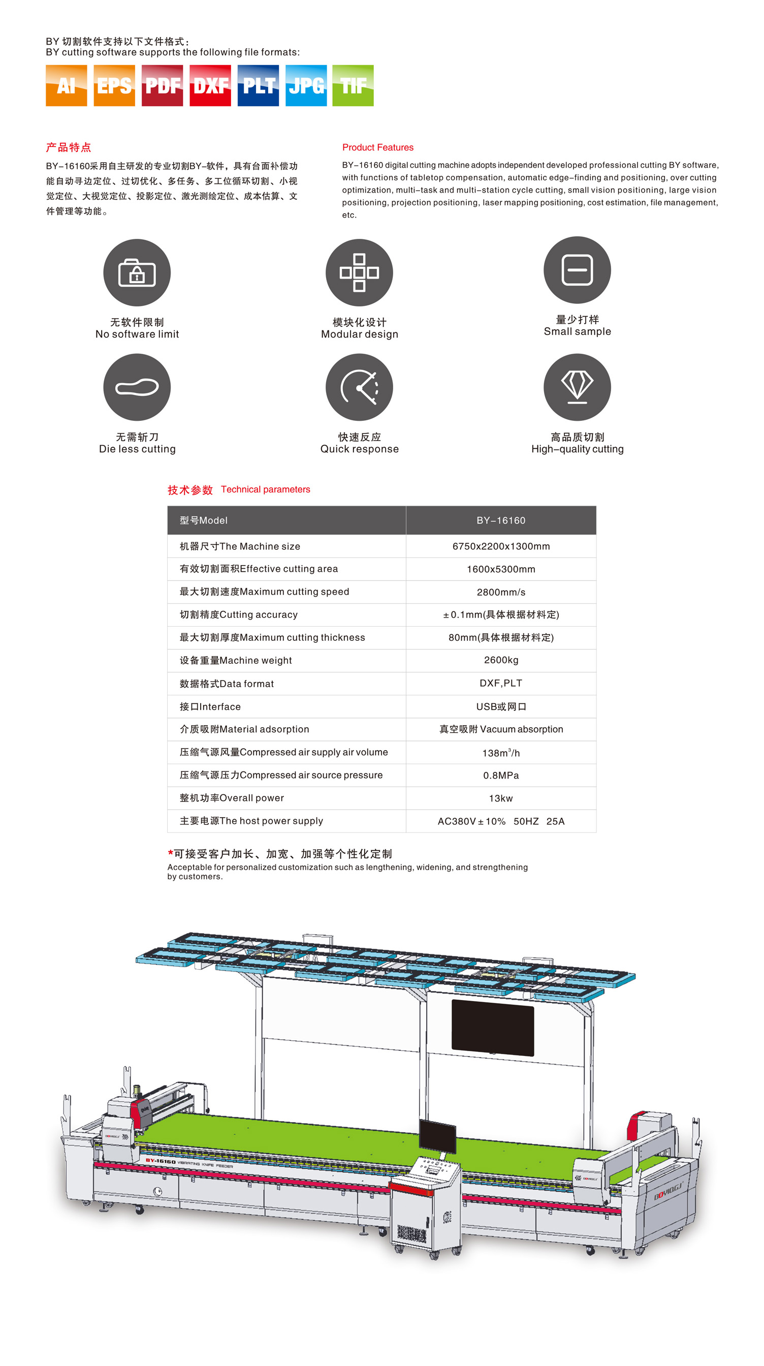 BY-16160采用自主研发的专业切割BY-软件,具有台面补偿功能自动寻边定位、过切优化、多任务、多工位循环切割、小视觉定位、大视觉定位、投影定位、激光测绘定位、成本估算、文件管理等功能。
